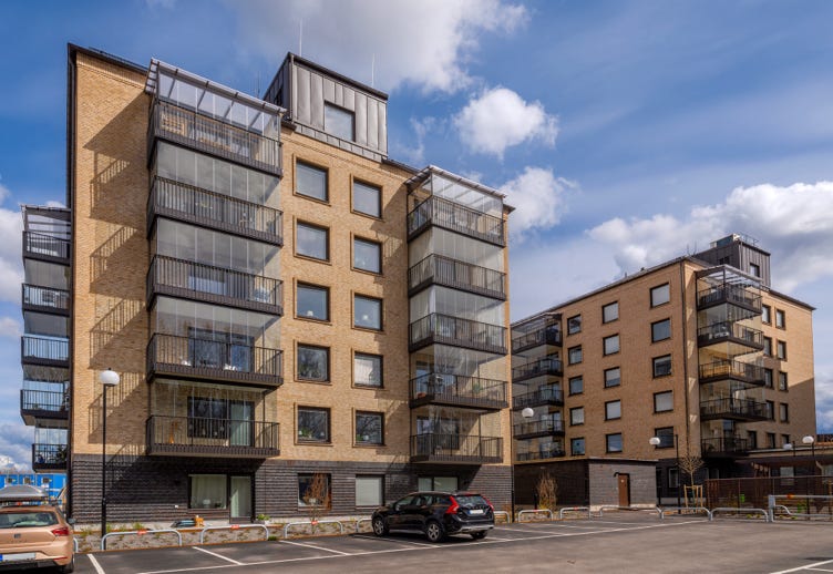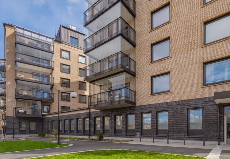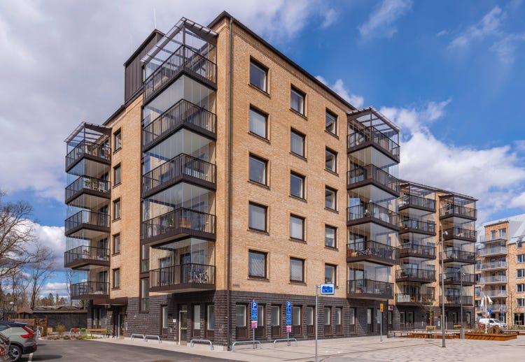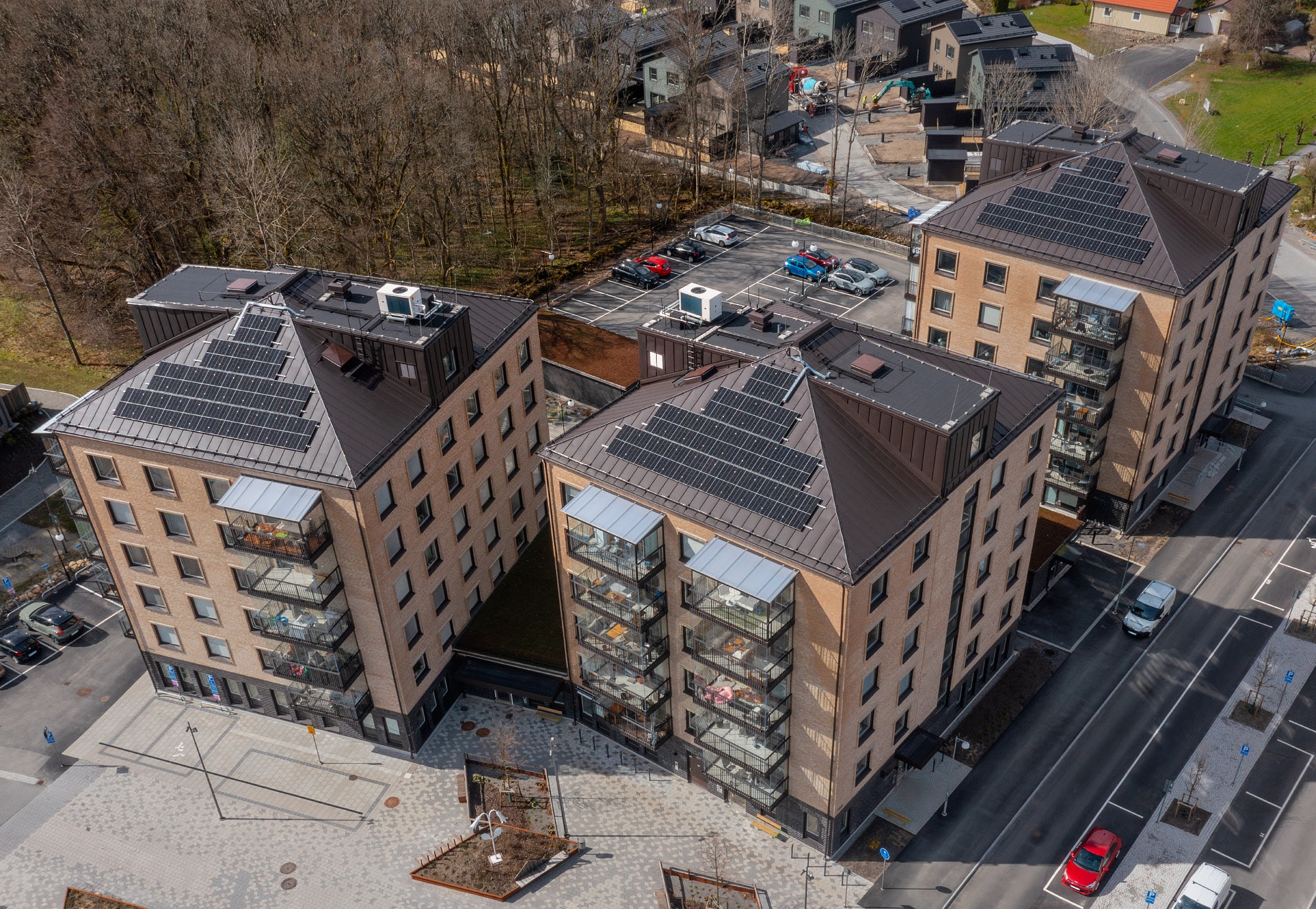 Projektet omfattar 63 lägenheter samt en vårdcentral i tre hus och utfördes för Partillebo med inflyttning 2023.
