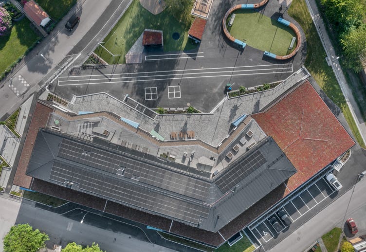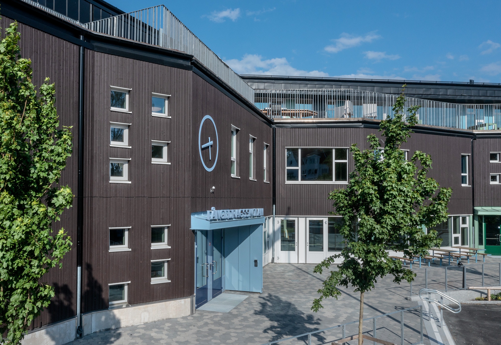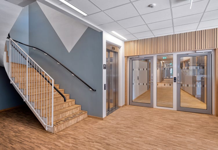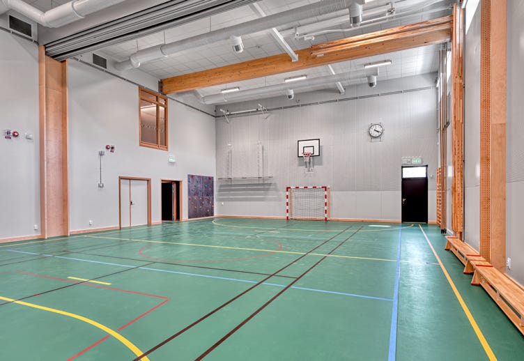 I entréplan kommer omklädningsrum och idrottssal samt skolans bibliotek att finnas Pả plan två finns lokaler för klasser, fritids och administration och på plan tre placeras främst fritidsverksamhet, slöjd och NO-sal.