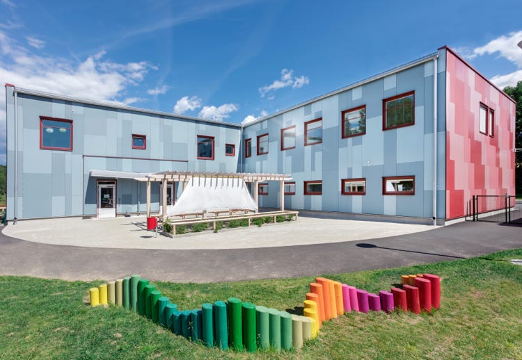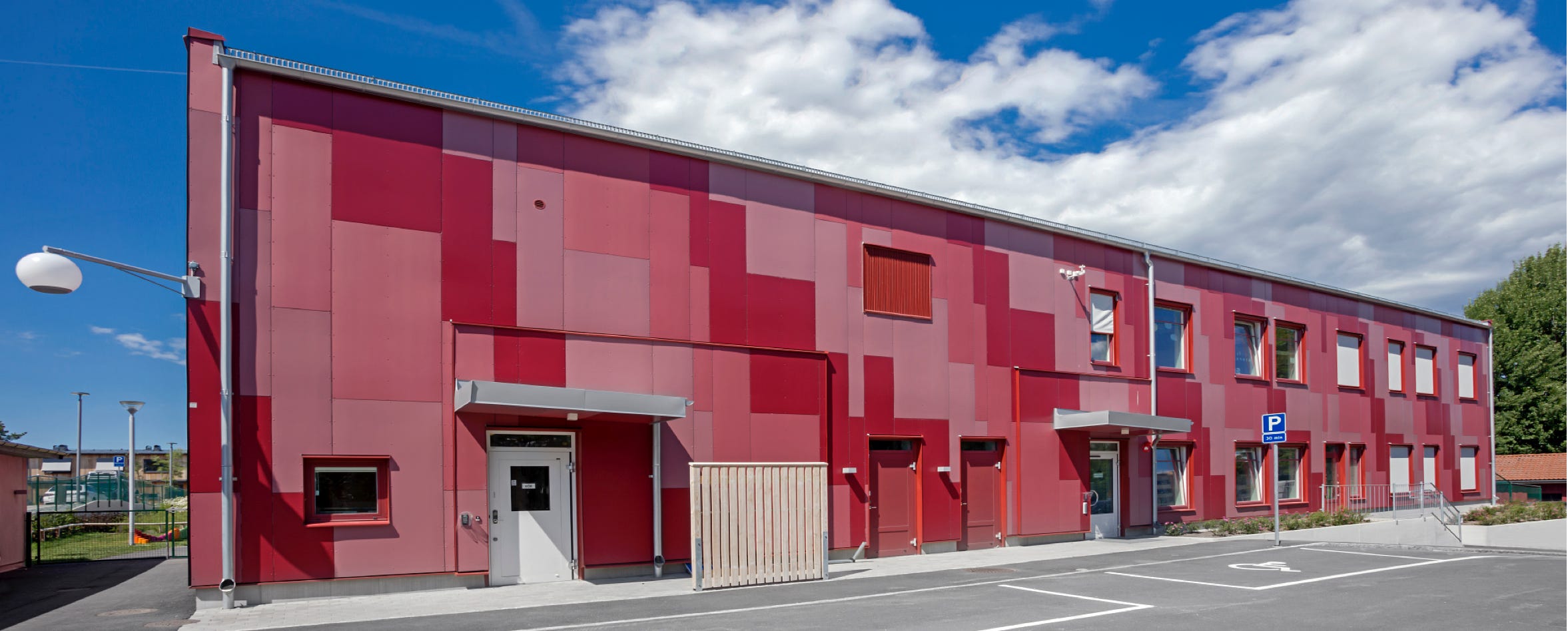 Denna färgstarka förskola är byggd i 2 plan med 5 avdelningar och tillhörande storkök.Platsbyggd stomme med platta på mark och 2 HDF bjälklag, övre HDF bjälklaget tillsammans med PIR isolering utgör tak. På baksidan finns en mysig gård för utevistelse och lek.