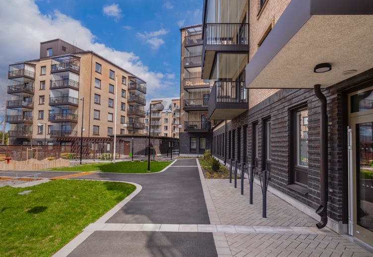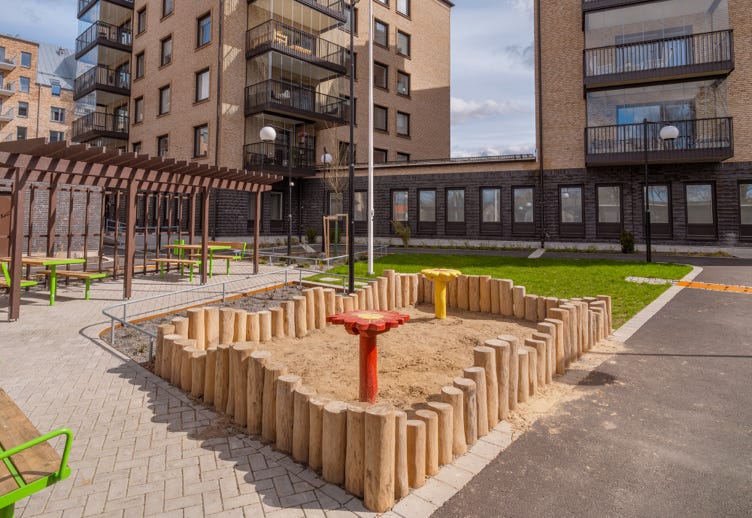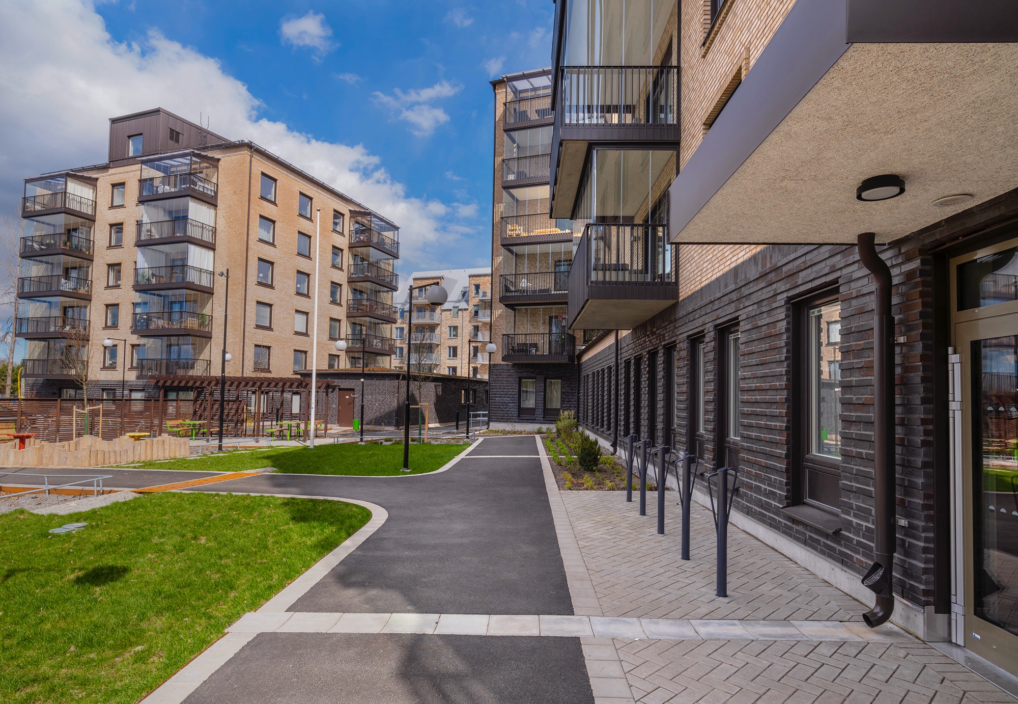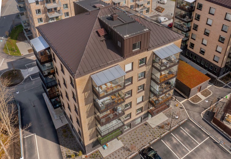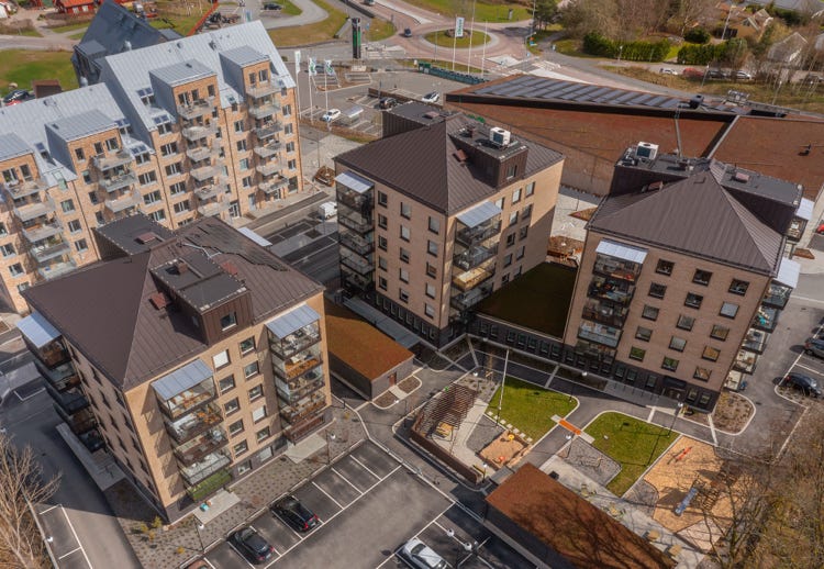Projektet omfattar 63 lägenheter samt en vårdcentral i tre hus och utfördes för Partillebo med inflyttning 2023.