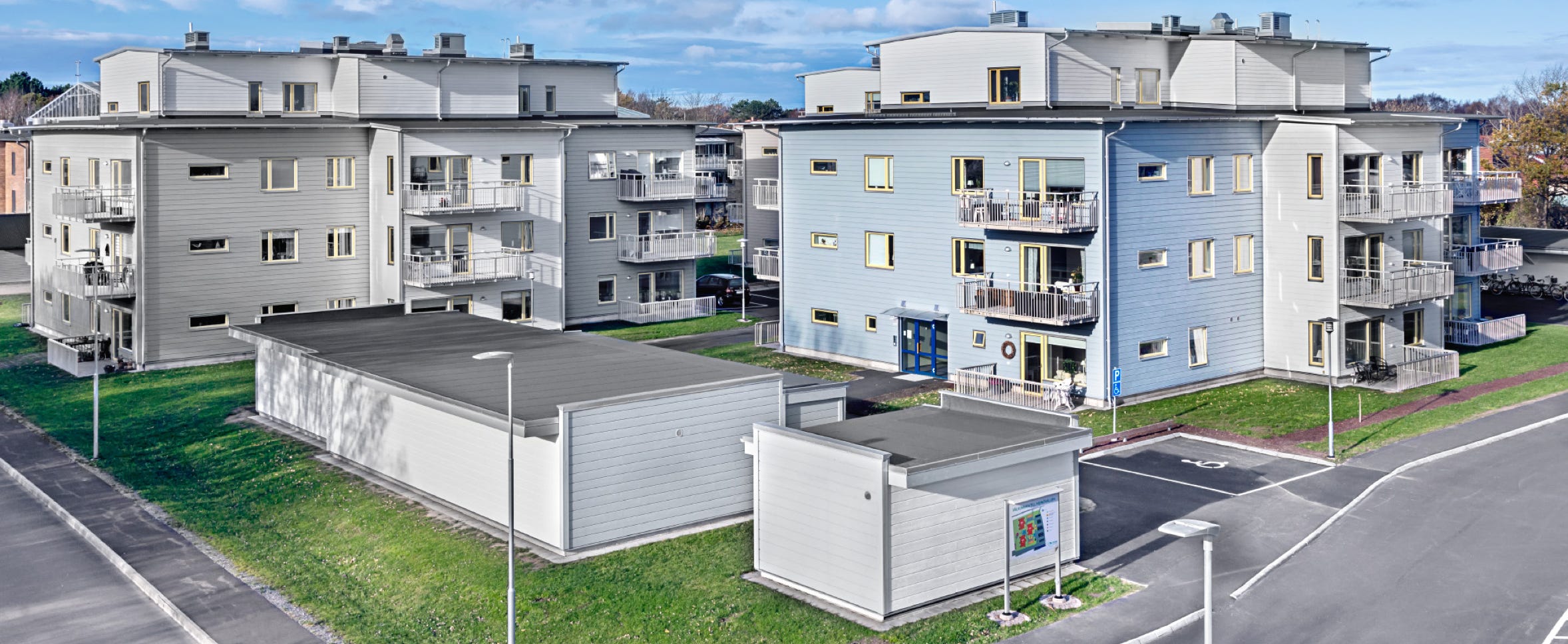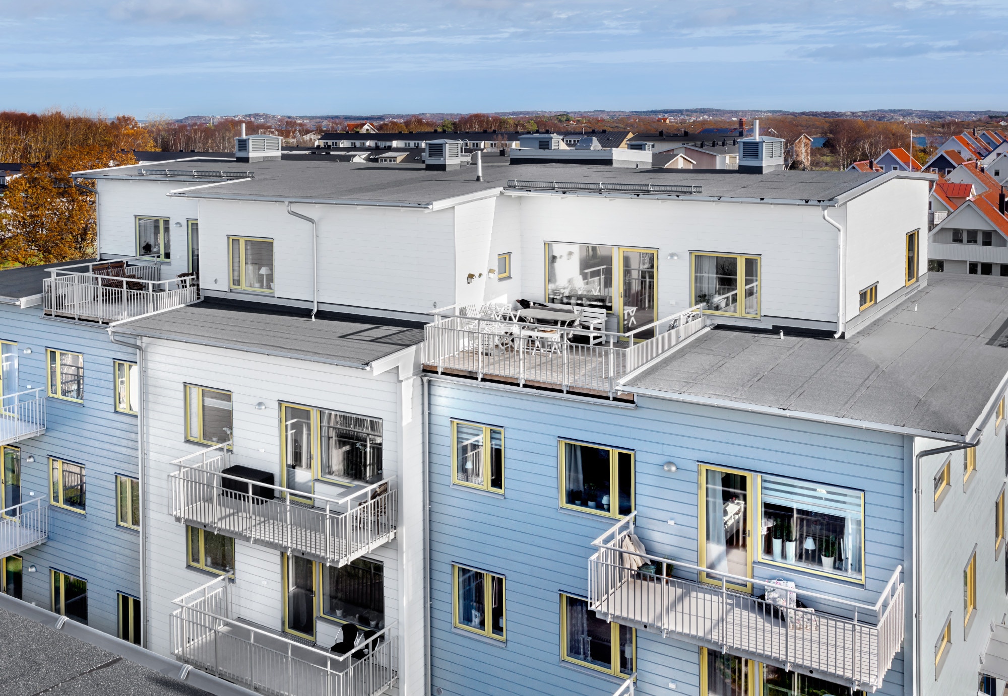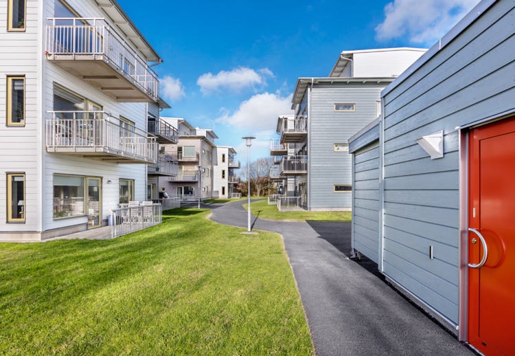 RA Bygg lägenhetshus som var antagna med en ny detaljplan för höjden. Med sina fyra våningar har man en fantastisk utsikt mot havet och Vinga fyr utanför Klåvas välkomnande hamn.