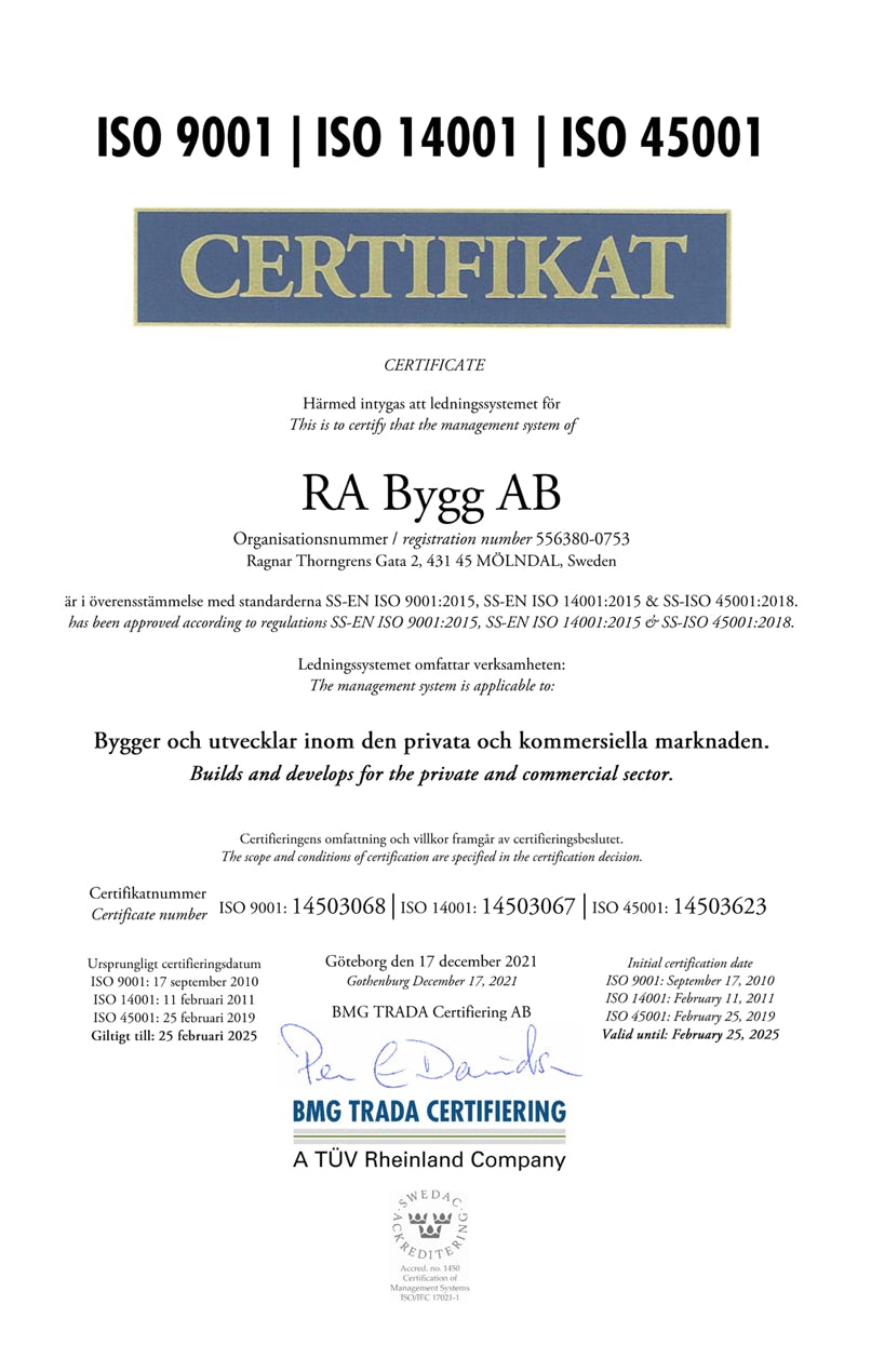 Genom att leva upp till kraven på såväl kvalitet som miljö och arbetsmiljö, ska RA Bygg även de kommande decennierna vara ett förstahandsval.