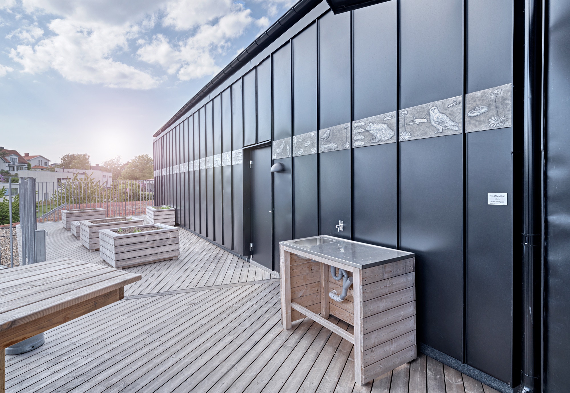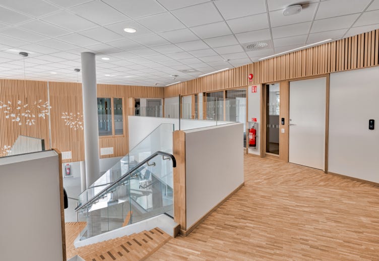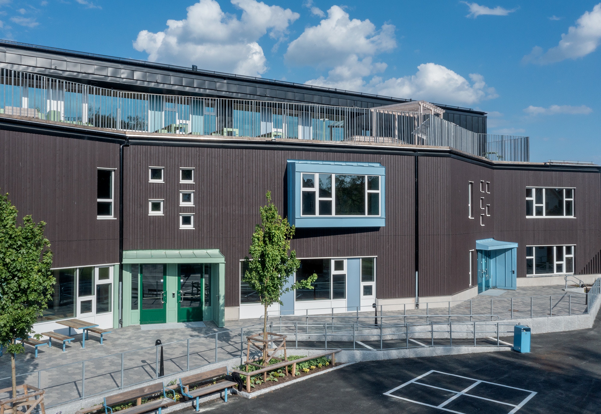 I entréplan kommer omklädningsrum och idrottssal samt skolans bibliotek att finnas Pả plan två finns lokaler för klasser, fritids och administration och på plan tre placeras främst fritidsverksamhet, slöjd och NO-sal.
