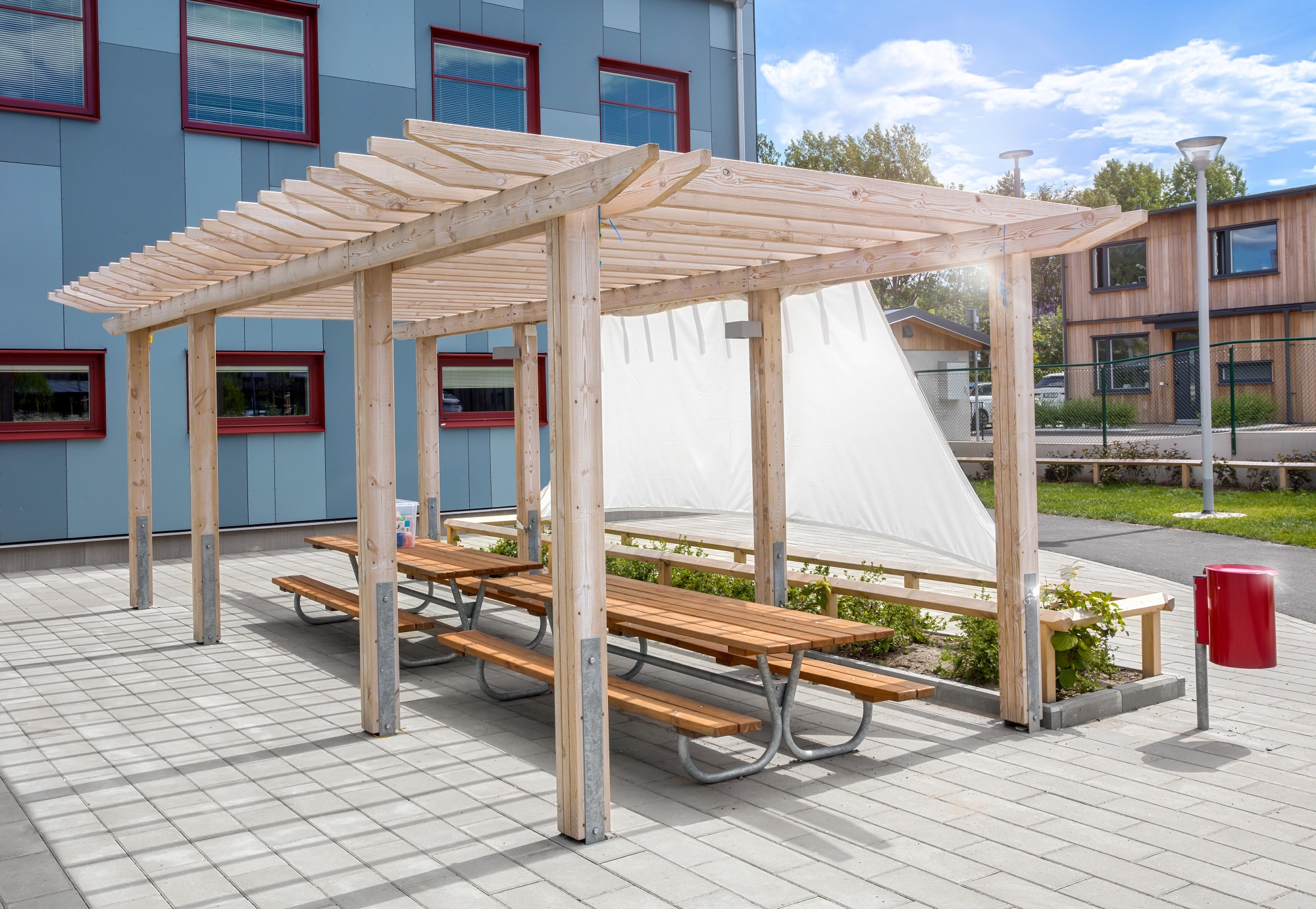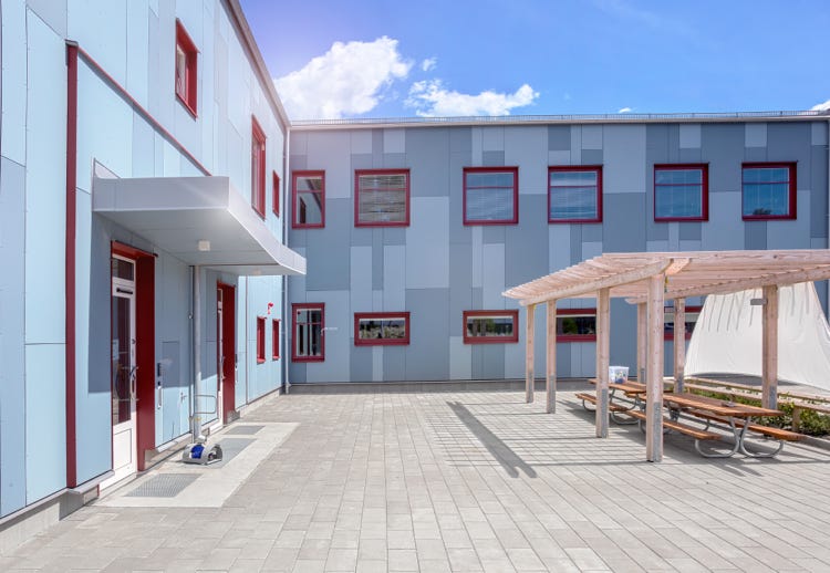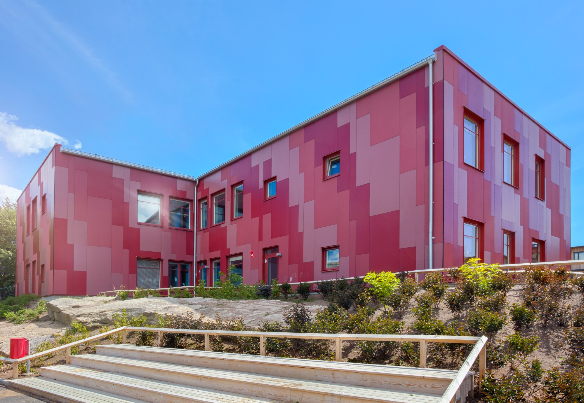 Denna färgstarka förskola är byggd i 2 plan med 5 avdelningar och tillhörande storkök.Platsbyggd stomme med platta på mark och 2 HDF bjälklag, övre HDF bjälklaget tillsammans med PIR isolering utgör tak. På baksidan finns en mysig gård för utevistelse och lek.